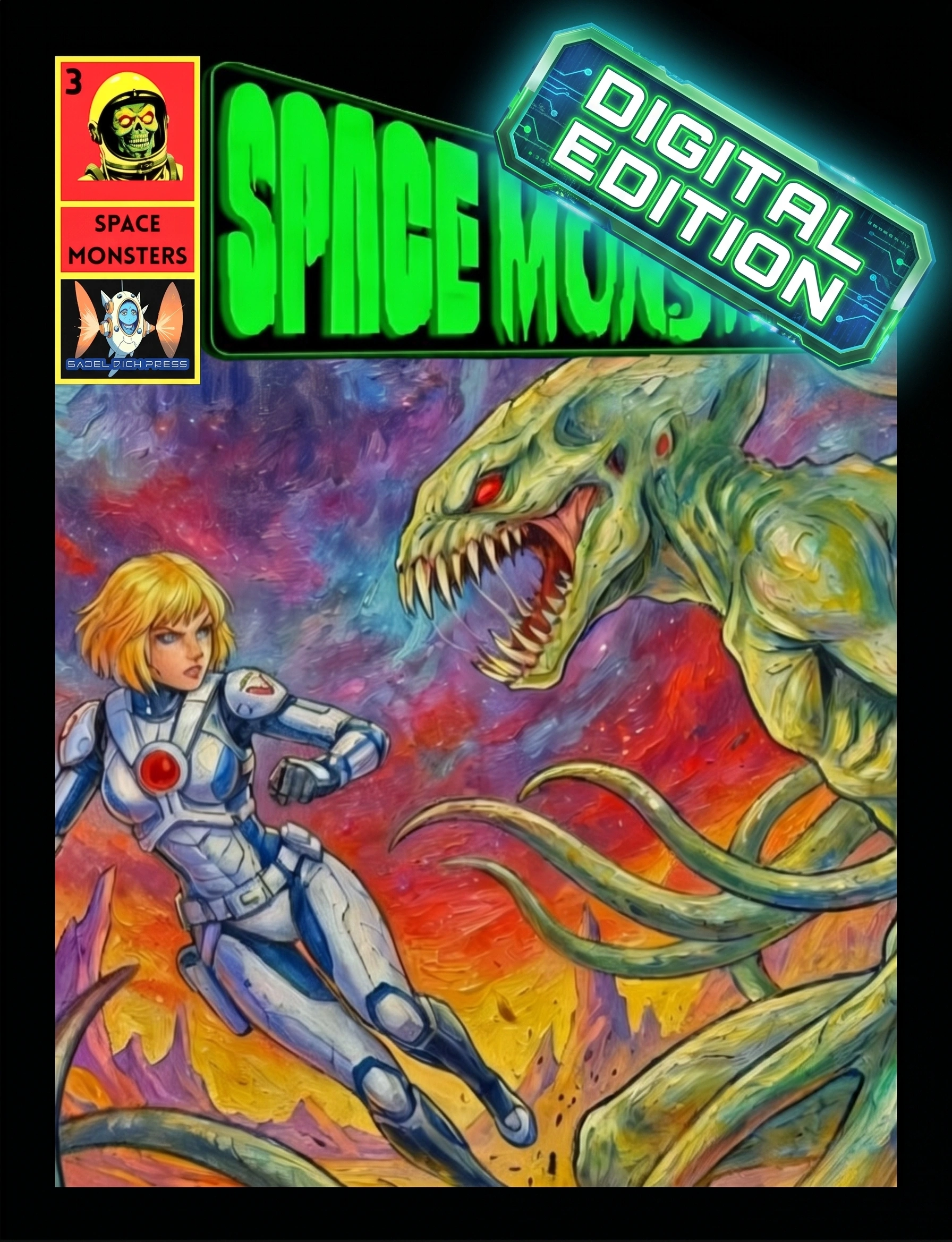Grimaldi and the crew of SM return for issue #3, which is a substantial upgrade from #1. Now in full color with 72 pages of interstellar terror, and terrestrial horrors for those hoping to avert Earthie destruction.